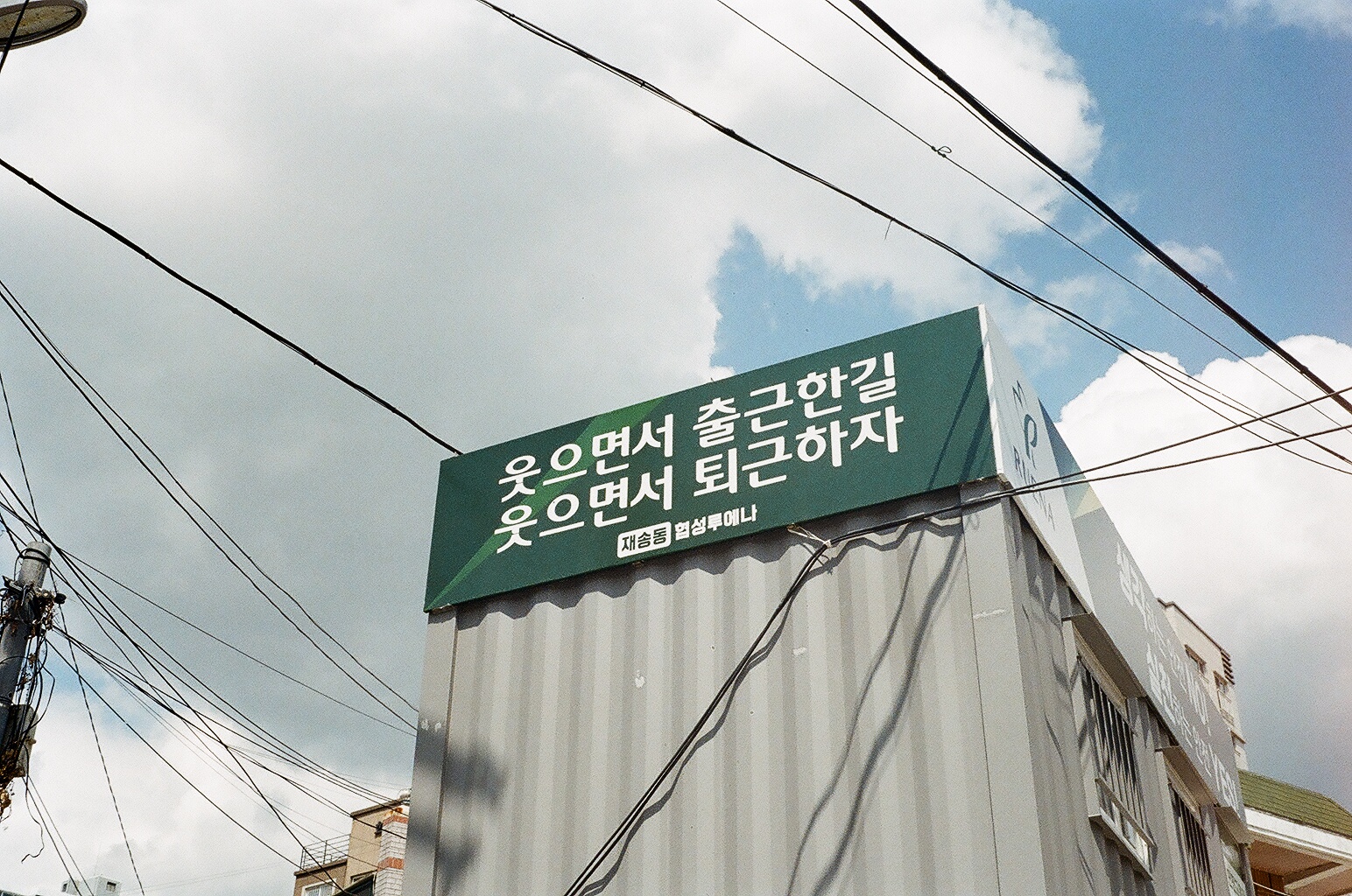 카메라 고치고 나오는 길에 있는 웃으면서 출근한길 웃으면서 퇴근하자 라는 말도 안 되게 긍정적인 문구를 봄