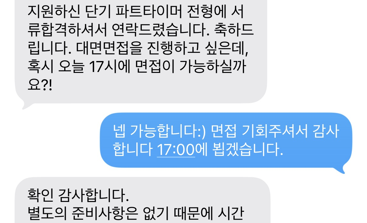서류를 제출한 날 바로 문자가 왔고 당일 면접을 바로 보고 당일 합격했다. 초스피드