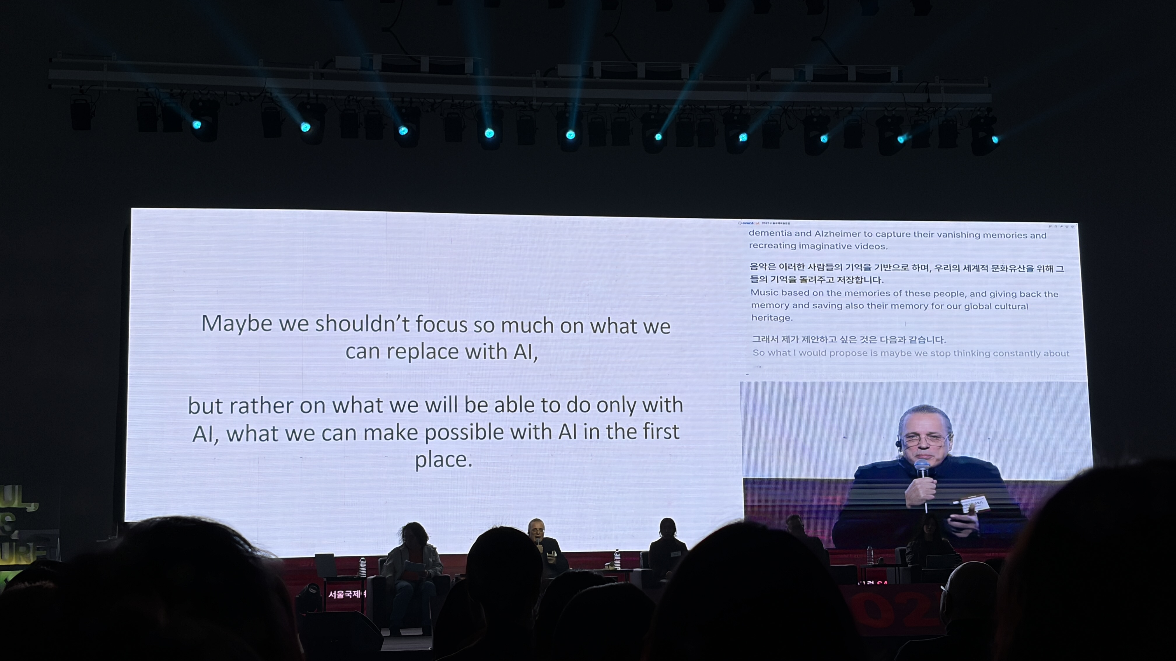 AI로 바로 실시간 번역해서 스크린에 띄워주니 소통에 문제도 없었고 필요한 사람은 동시통역기 대여도 가능했음